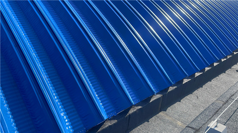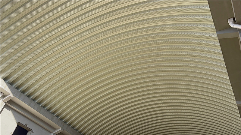 本次拱形波紋鋼屋面采用914-610型結構,拱跨18.10米,長度85.82米,總覆蓋面積超1500㎡。屋面選用冠洲品牌彩涂卷,厚度1.0mm,正面海藍色、背面灰白色,兼顧耐腐蝕性與視覺協調性。