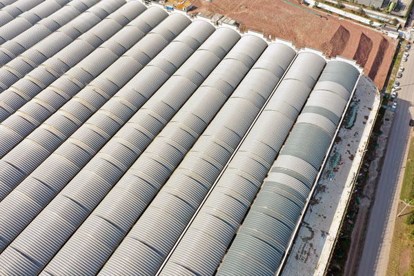 屋蓋采用單坡形式拱形結(jié)構(gòu),具有良好的排水與抗風(fēng)性能,結(jié)構(gòu)穩(wěn)定,便于后期維護(hù),適用于糧酒等生產(chǎn)場景中對潔凈度與空間利用率有較高要求的廠房結(jié)構(gòu)。